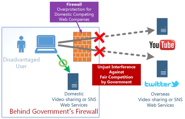 Free competition around the globe is essential for improving online services. Internet provides such a great field for fair competition. However, some countries are attempting to disrupt fair competitions. For example, great video-sharing sites such as YouTube, or excellent SNS sites such as Twitter or Facebook are out. However, some governments do not let their people access these great websites within the country. Such filtes are commonly called "Firewall" . People in such country are often affected by the government's firewall.